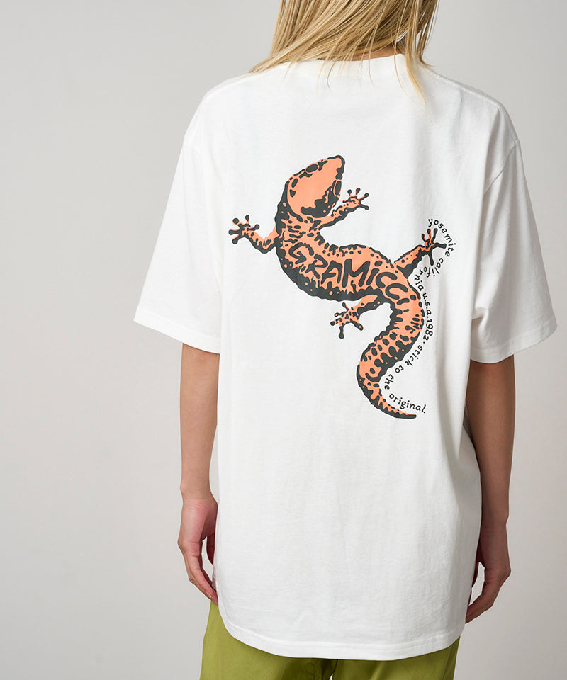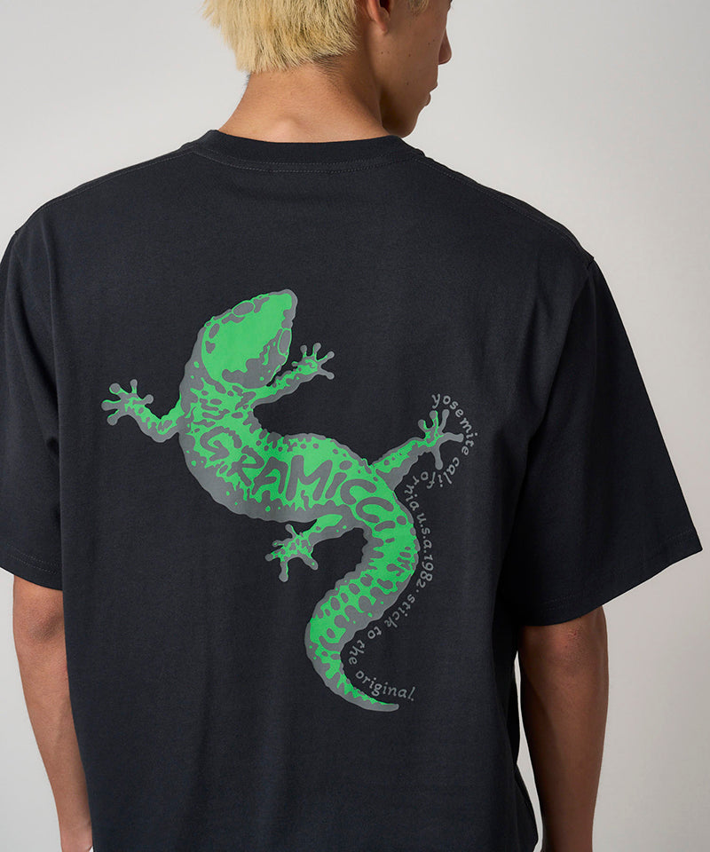 The Gramicci Gecko Tee celebrates nature's original wall-crawling specialists, geckos, who've been defying gravity and making impossible moves look effortless since way before anyone invented sticky rubber climbing shoes. The large back gecko graphic is a tribute to those tiny masters of grip strength who somehow manage to stick to any surface while looking completely relaxed about the whole situation, basically the climbing goals we're all secretly aspiring to. It's the kind of mid-weight tee that gets the gecko philosophy: stay cool under pressure, always have a good grip on the situation, and when things get sketchy, just remember that you're basically a small dinosaur with superpowers.